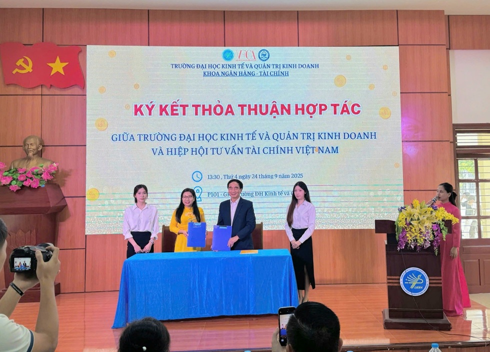 24/09/2025Ngày 24/9/2025, Trường Đại học Kinh tế và Quản trị kinh doanh (TUEBA) đã long trọng tổ chức Lễ ký kết Biên bản ghi nhớ hợp tác (MOU) với Hiệp hội tư vấn tài chính Việt Nam (VFCA)