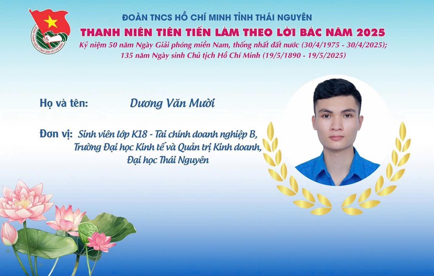 Sáng ngày 24/4/2025, tại Khu di tích Quốc gia đặc biệt ATK Định Hóa đã diễn ra chương trình Tuyên dương “Thanh niên tiên tiến làm theo lời Bác” năm 2025. Khoa Ngân hàng - Tài chính, Trường ĐH Kinh tế & QTKD rất vinh dự có sinh viên DƯƠNG VĂN MƯỜI – Lớp K18 TCDN B đã được tuyên dương danh hiệu “Thanh niên tiên tiến làm theo lời Bác” tỉnh Thái Nguyên năm 2025.